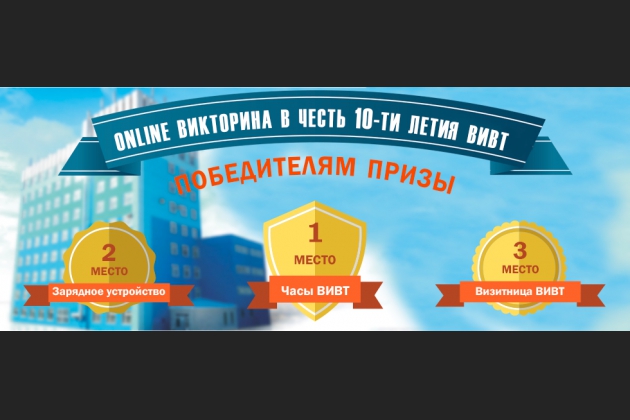 В 2014-2015 учебном году Воронежский институт высоких технологий отмечает 10 лет с момента постоянной прописки по адресу: ул. Ленина, д. 73а. Предлагаем ответить на вопросы online викторины, связанные с этим событием. Принять участие могут студенты и выпускники ВИВТ. Ответы от участников будут приниматься с 17 февраля до 5 марта. Итоги будут подведены в течении 1-2 дней по завершению викторины. Победителем станет участник, набравший максимальное количество правильных ответов. Победителей ждут корпоративные призы и подарки. 1 место - Часы ВИВТ 2 место - Зарядное устройство Power Bank 3 место - Визитница-карандашница с логотипом ВИВТ